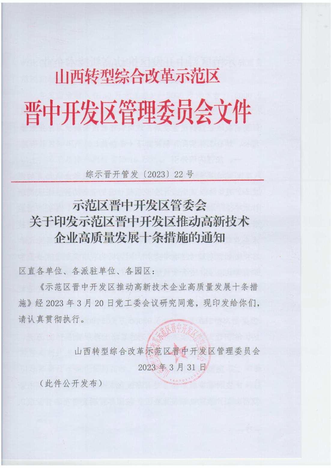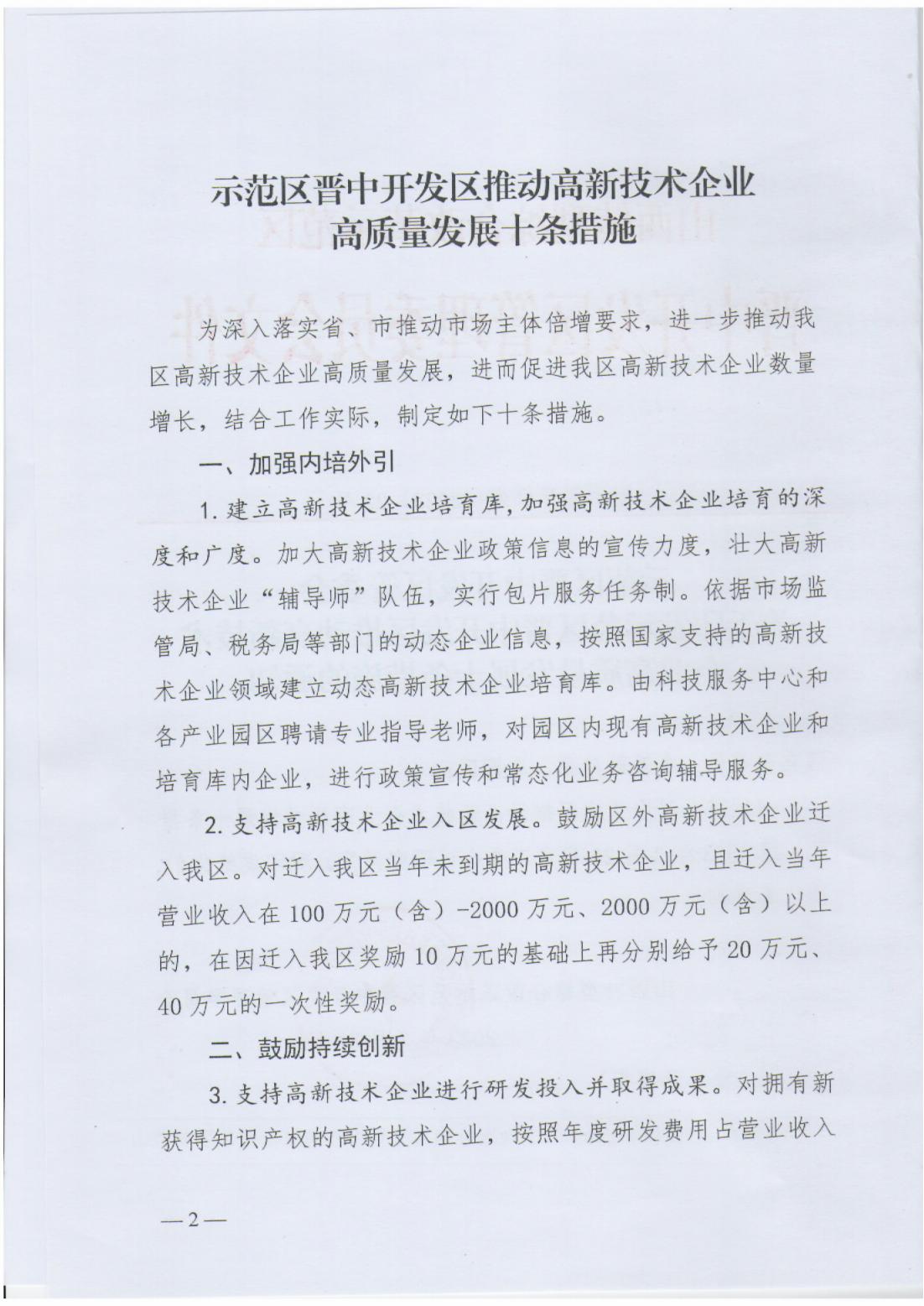 關(guān)于印發(fā)示范區(qū)晉中開發(fā)區(qū)推動(dòng)高新技術(shù)企業(yè)高質(zhì)量發(fā)展十條措施的通知